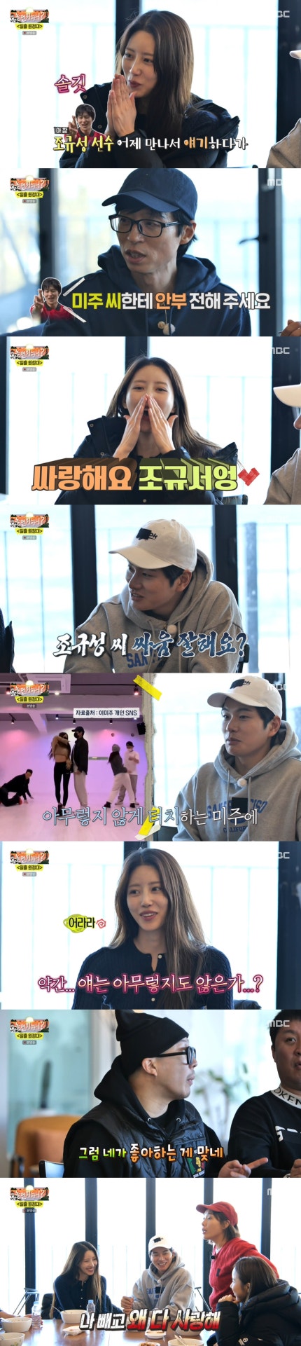 유재석은 제작진이 준비한 떡국을 먹으며 조규성 선수와의 후일담을 전해 이미주의 눈을 초롱초롱하게 만들었다.Yoo Jae-seok made Lee Mi-joo's eyes sparkle by telling her future story with Cho Kyu-sung while eating rice cake soup prepared by the production team. 유재석은 "오해하지 말고 들어라.Yoo Jae-seok said, "Don't get me wrong. Listen to me." 조규성 선수가 툭 던진거다.It was thrown by Cho Kyu-sung. 엄청난 뜻을 내포한 건 아니다.It doesn't mean a lot. 확대 해석 하지마라"면서 "'미주 씨한테 안부전해주세요'라더라"고 말해 이미주를 들뜨게 만들었다.Don't enlarge the interpretation, he said, and said, "I heard you say hello to Mi-Joo," making Mi-Joo excited. 이미주는 "진짜 별거 아니다"라는 등 멤버들의 시큰둥한 반응에도 아랑곳하지 않고 "나 잘지낸다.Lee Mi-joo said, "I'm doing well," regardless of the members' lukewarm responses, such as "It's really nothing." 사랑해요 조규성"을 외쳤다.I love you, Kyu-sung Cho." 이를 들은 이이경은 떨떠름한 표정을 지은 채 "조규성 선수 싸움 잘하냐"며 질투했다.Hearing this, Lee Yi-kyung looked disappointed and jealous, saying, "Is Cho Kyu-sung good at fighting?"