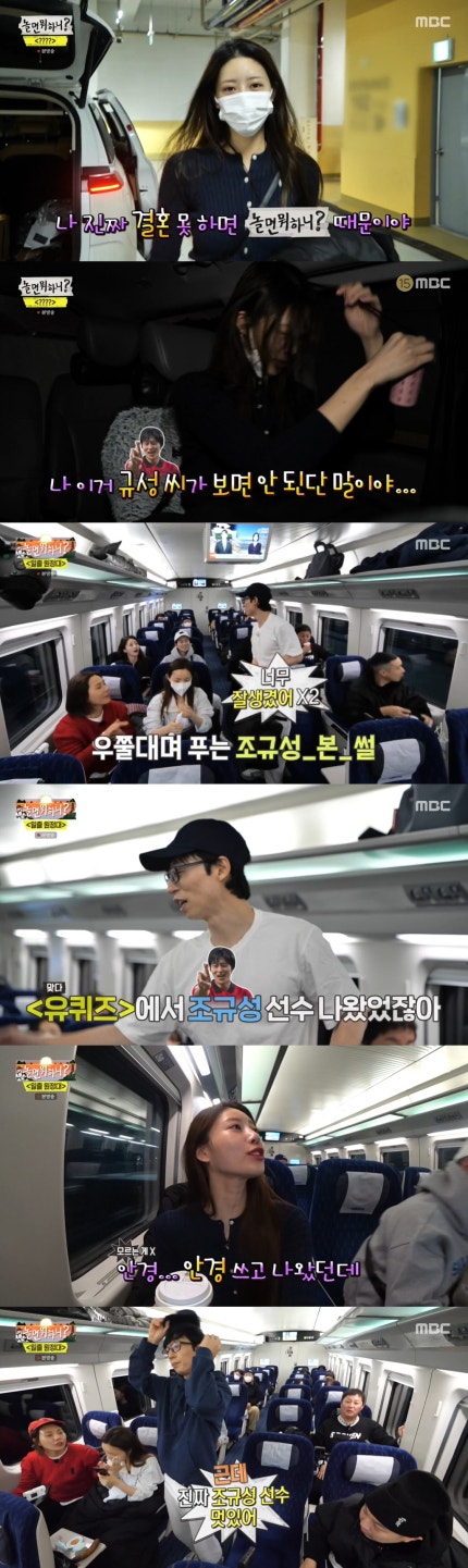 힘겹게 기차에 탄 멤버들.The members got on the train with difficulty. 그때 유재석은 "tvN '유퀴즈 온더 블럭'에 조규성 선수 나왔다.At that time, Yoo Jae-seok said, "Cho Kyu-sung appeared on tvN's 'You Quiz on the Block.' 너무 잘생겼다"고 언급했고, 이미주는 "안경 쓰고 나왔던데"라며 관심을 보였다.He mentioned that he was so handsome, and Lee Mi-joo showed interest, saying, "He came out wearing glasses. 유재석은 "조규성 선수 멋있다.Yoo Jae-seok said, "Cho Kyu-sung is cool. 남자가 멋있다고 할 정도"라면서 "진짜 모든 걸 다 가졌다라는 생각에 부럽더라"고 했다.He said, "I was jealous of the thought that a man was cool," adding, "I really had everything."