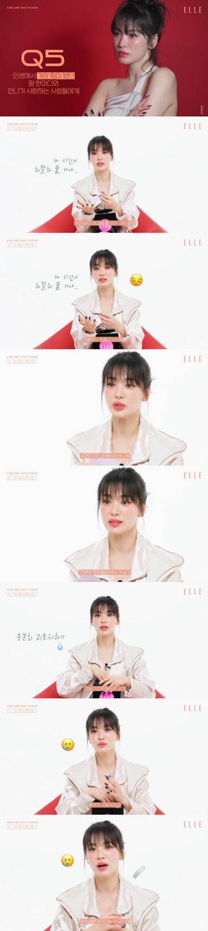“인생에서 가장 힘이 됐던 말 한마디와 사랑하는 사람들에게 해주고 싶은 말”에 대한 질문에 송혜교는 “‘시간이 다 해결해 줄 거야’라는 말이 솔직히 짜증났다”며 경험담을 말했다.When asked about "one word that gave me the most strength in my life and what I want to say to my loved ones," Song Hye-kyo said, "To be honest, the word 'time will solve everything' was annoying."