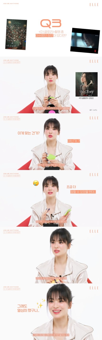 해당 영상에서 송혜교는 넷플릭스 오리지널 시리즈 '더 글로리' 촬영 중 아쉬웠던 장면이 있느냐라는 질문을 받았다.In the video, Song Hye-kyo was asked if there were any disappointing scenes while filming the Netflix original series "The Glory." 이에 그는 "첫 장르물이라 초반 촬영분이 다 어려웠다.In response, he said, "Since it was the first genre, it was difficult to film all the early scenes. '과연 이게 맞는 건가?' '아닌가?' 이런 생각들을 정말 많이 했다."Is this right?" "Isn't it?" I thought that a lot. 이미 지나갔지만, 기회가 된다면 초반 신을 다시 찍고 싶다는 생각을 많이 했다"라고 터놓았다.It's already gone, but I thought a lot about filming the scene again in the beginning if I had a chance."