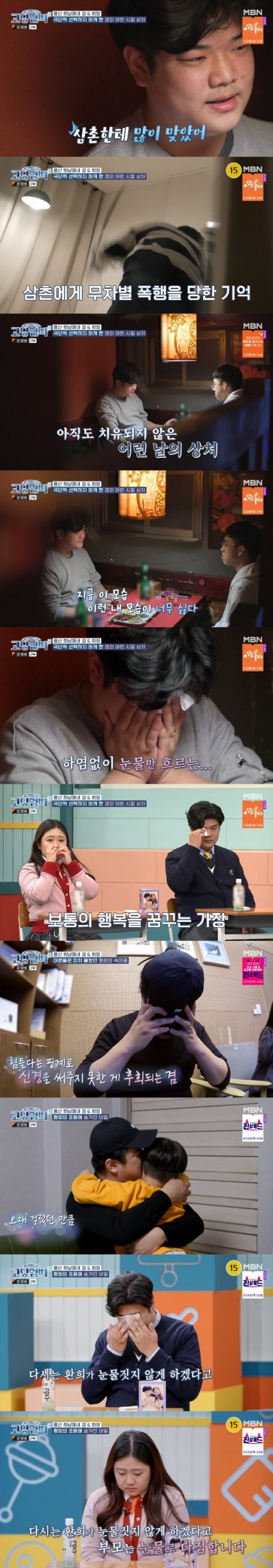 이 같은 마음의 병은 교통사고 트라우마 때문만은 아니었다.This mental illness was not only caused by traffic accident trauma. 김겸은 "이유가 있을 거 아니냐"라고 묻는 친구에게 "어릴 때 자랐던 가정환경 때문이라고 해야 하나.Kim Gyeom said to a friend who asked, "There must be a reason," "Should I say it's because of the family environment that I grew up in when I was young?" 엄마도 일찍 돌아가시고 할머니, 할아버지 밑에서 자랐는데 같이 살았던 삼촌이 있다.My mother died early and I grew up with my grandmother and grandfather, and I have an uncle who lived with me. 그때 삼촌한테 많이 맞았다.My uncle hit me a lot then. 집에 돌아오면 불을 꺼놓고 회초리부터 시작해서 맞기 시작했는데, 내가 그걸 피할 때마다 조금 더 단단한 걸로 바꾸면서 맞았던 거 같다.When I got home, I turned off the light and started getting hit with a whip, but every time I avoided it, I changed it to something a little harder and I think I got hit. 7살 때부터 중학교 때까지 삼촌과 같이 살았는데 그 기간 동안 내내 그랬다.I lived with my uncle from the age of seven to junior high school, and that was the case throughout that period. 이게 마음의 정리가 안 되니까, 내 삶이 없어진 듯한 느낌이다.Since I can't organize my mind, I feel like my life is gone. 계속 그런 느낌을 받더라.That's what I've been feeling. 지금 이런 내 모습이 너무 싫다 그냥.I just hate how I look right now. 정신적 문제를 치료해야 아내한테도, 우리 애들한테도 그렇고 좋은 아빠이고 좋은 남편이 될 수 있을 거 같은데.I think I can be a good father and a good husband for my wife and my children only if I treat my mental problems. 나도 우리 가족이 평범한 가족처럼 행복했으면 좋겠다"라고 눈물로 털어놨다.I hope my family will be happy like an ordinary family," he said with tears.