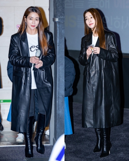 김성현 기자 : 올블랙 속 유일하게 빛나는 것은 이민정 씨의 미모뿐이다.Reporter Kim Sung-hyun: The only thing that shines in all black is Lee Min-jung's beauty. 블랙 롱코트에 블랙 부츠 그리고 블랙 팬츠까지.Black long coat, black boots and black pants. 영화 매트릭스 시리즈가 연상되는 패션.Fashion reminiscent of the movie "The Matrix" series.