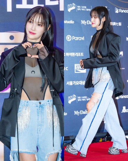 강내리 기자: 패션은 과유불급이다.Reporter Kang Na-ri: Fashion is too much and too much. 한껏 섹시해 보이고 싶었던 스타일링의 의도는 알겠으나, 모든 아이템에 힘을 줘 어지럽기만 한 룩이 되고 말았다.I understand the intention of styling to look sexy as much as possible, but it became a dizzy look by putting strength on all the items. 루즈 핏 재킷에 통이 넓은 진을 매치한 점도 아쉽다.It is also regrettable that the loose-fit jacket was matched with wide jeans. 키가 더 작아 보이도록 만들었다.I made him look shorter.