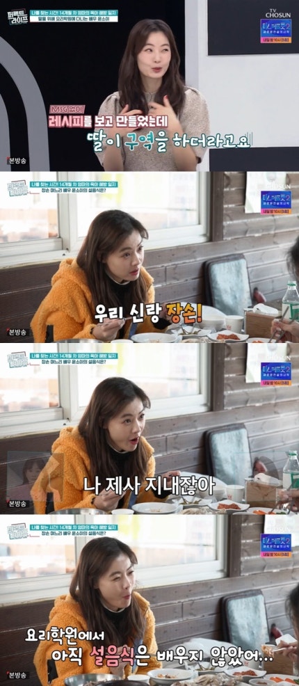 이어 윤소이는 절친인 배우 문보령과 명절 음식 이야기를 나눴고, 문보령이 명절 음식을 줄이고 있다고 말하자 “(남편이) 장손이라 나 제사 지낸다.Yoon So-yi then talked about holiday food with her best friend, actress Moon Bo-ryeong, and when Moon Bo-ryeong said she was reducing holiday food, she (husband) is the eldest son, so she holds a memorial service. 요리학원에서 아직 설음식은 배우지 않았다”고 웃으며 말해 눈길을 끌었다.I haven't learned New Year's food yet at the cooking academy," he said with a smile. (사진=TV조선 ‘퍼펙트라이프’ 캡처)(Photo = TV Chosun "Perfect Life" capture)