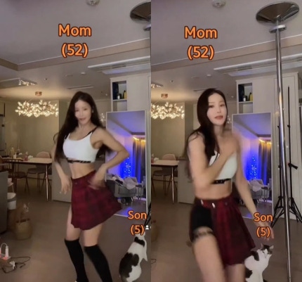 미나는 몸매가 드러나는 의상을 입고 음악에 맞춰 춤을 추고 있는 모습.Mina is dancing to the music in a costume that reveals her figure. 꾸준한 자기 관리로 만들어낸 군살 하나 없는 탄탄한 몸매가 놀라움을 안긴다.The solid figure without any flab created by constant self-management is surprising. 또 시선을 끄는 것은 '52살 엄마', '5살 아들'이라고 적혀있는 문구.Also eye-catching are the phrases that say '52 years old mother' and '5 years old son'. 귀여운 반려 동물과 함께한 귀여운 일상이 미소를 자아낸다.A cute daily life with a cute companion animal brings out a smile.