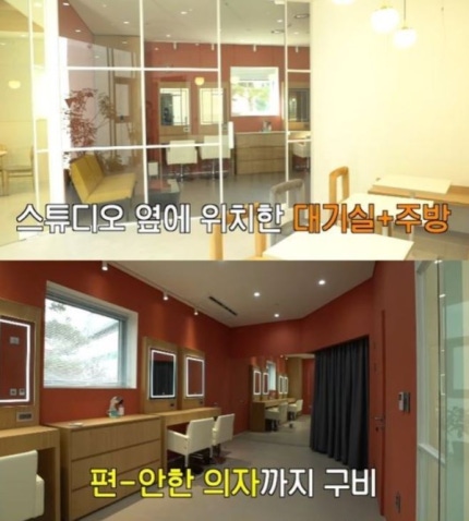 이어 송은이는 "그다음에 이쪽 보면 그린 보드가 돼있다"고 설명한 뒤, 스튜디오 옆에 있는 대기실과 주방도 소개했다.Song Eun-i then explained, "Next, if you look here, it's a green board," and then introduced the waiting room and kitchen next to the studio. 송은이는 "이렇게 앉아서 얘기나눌수 있고 간단히 회의도 할수 있다.Song Eun-i said, "We can sit down and talk like this and have a simple meeting. 여기는 대기실 공간이다.This is the waiting room. 대기실 없는 스튜디오 많지 않나.Aren't there many studios without waiting rooms? 메이크업 가능하고 옷을 갈아입을 수 있게 돼있고 큰 거울이 있다"고 설명했다.It's made up, you can change clothes, and there's a big mirror."