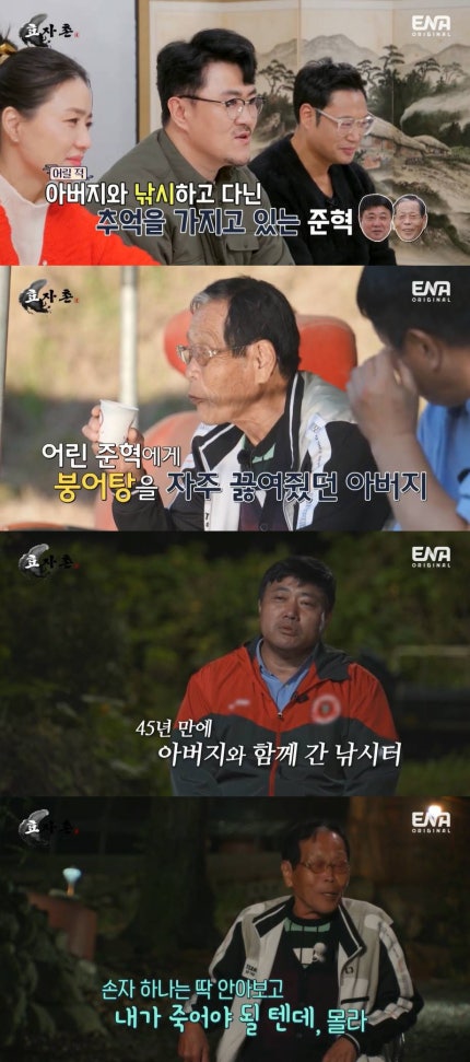 양준혁은 "어릴 때 아버지랑 같이 낚시 가서 낚싯대 던져 놓고, 매운탕도 끓여 먹던 기억이 있는데 45년 만에 간 것 같다.Yang Joon-hyuk said, "I remember going fishing with my father when I was young, throwing a fishing rod, and boiling spicy fish stew, but I think I went there after 45 years. 왜 아버지랑 이런 시간을 자주 못 가졌었나?Why didn't I spend this much time with my father? 라는 생각이 들었다.I had the feeling that 아버지랑은 멀어졌는데 많이 가까워졌다"며 효자촌에서의 수확을 밝혔다.I've grown away from my father, but I've gotten a lot closer."