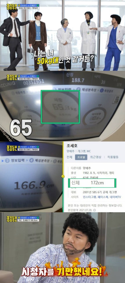 하지만 측정 결과 조세호의 키는 166.9cm였다.However, Jo Se-ho was 166.9 centimeters tall. 홍진경은 "쟤 167cm이야"라고 단정지었고, 주우재는 "육칠이"라며 "우리는 프로필 상에서 오차가 별로 없는데 5cm가 차이 나는 분이 있다"며 언급했다.Hong Jin-kyung concluded, "He is 167cm tall," and Joo Woo-jae said, "Yook-chil," adding, "We don't have much error on our profiles, but there is a 5cm difference." 우영 역시 "시청자를 기만했다.Woo-young also said, "I deceived the viewers. 이 정도면 대국민 사과 해야 된다"라고 말했다.We should apologize to the public for this rate."