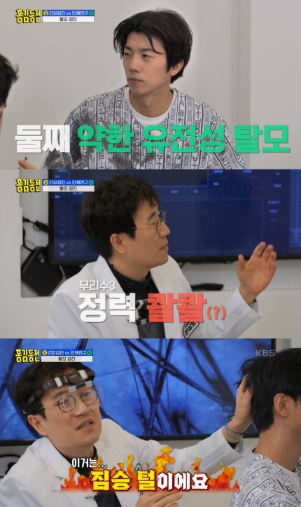 하지만 이은 탈모 검사에서 "아버지께서 탈모가 있으시다.However, in the subsequent hair loss test, "My father has hair loss. 앞과 옆 둘 다 없으시다"며 걱정을 보였던 조세호는 "약 먹을 필요도 없는, 서울대 두 번 갈 수도 있는 타입이다.Cho Se-ho, who showed concern, said, "You don't have to take medicine, but you can go to Seoul National University twice." 정력 콸콸이다"라며 상반된 결과를 받았다.I'm full of energy," he said, receiving conflicting results.