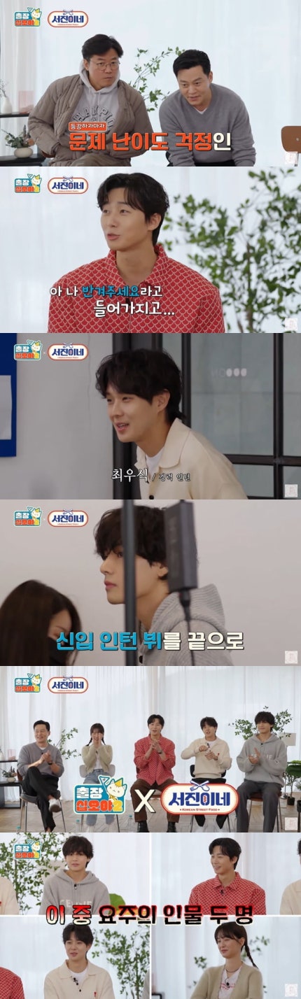 '채널 십오야'는 '서진이네' 팀으로 출장을 나왔다.Channel Fifteen is on a business trip to Seojin's team. 가장 먼저 출근한 사람은 '사장' 이서진이었다.The first person to go to work was "CEO" Lee Seo-jin. 이서진은 "조금 쉬운 걸로.Lee Seo-jin said, "A little easier. 쉬운 걸로 해줘"라고 말했다.I'd like an easy one." 이어 등장한 사람은 '부장' 박서준이었다.The next person to appear was Park Seo-joon, the "director." '이사' 정유미의 등장에 박서준은 "반겨주세요라고 들어서 우와 할 뻔 했다"며 웃었다.Park Seo-joon laughed at the appearance of "Move" Jung Yoo-mi, saying, "I almost said wow because I was told to welcome you." '경력 인턴' 최우식, '신입 인턴' 뷔를 끝으로 '서진이네' 팀이 출근을 완료했다.With Choi Woo-sik, a "career intern," and V, a "new intern," the "Seojin's" team has completed their work.