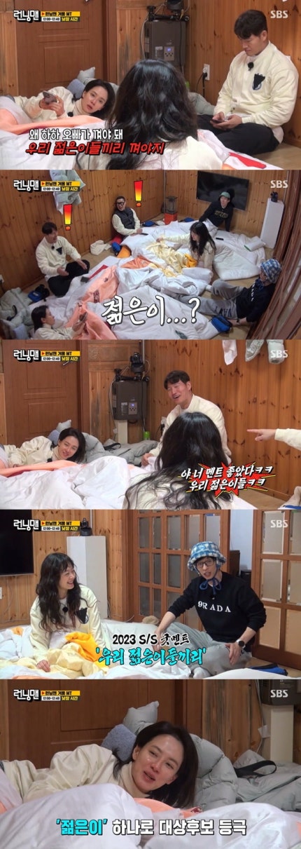 이날 방송에서 '런닝맨' 멤버들은 겨울 MT를 떠났다.On the show, the members of "Running Man" left for the winter MT. 낮잠 시간에 멤버들은 휴식을 취했다.During the nap, the members rested. 그러던 중 송지효는 "야 왜 하하 오빠가 껴야 돼?Meanwhile, Song Jihyo said, "Hey, why does Haha have to join us. 우리 젊은이들끼리 껴야지"라고 물었다.We're going to join the youngsters." 이를 들은 '런닝맨' 멤버들은 폭소했다.The "Running Man" members burst into laughter when they heard this.