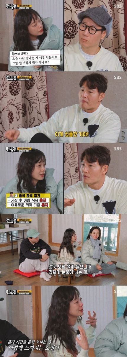 김종국은 "운동도 혼자 한다.Kim Jong-kook said, "I also exercise alone. 하다 보면 연예인들도 오고 후배들도 온다.Celebrities come and juniors come. 인사하고 운동 알려 달라고 하면 알려준다.If you say hello and ask me to teach you exercise, I will tell you. 그렇게 하고 보낸다.That's how I spend my time. 그리고 집에 간다.Then I go home. 귀가 후 넷플릭스 본다"고 설명했다.I watch Netflix after I get home." 양세찬은 "이게 무슨 인간관계냐.Yang Se-chan said, "What kind of relationship is this? 슬프고 외롭다"고 했다.I'm sad and lonely." 이때 전소민이 눈물을 보였다.At this time, Jeon So-min showed tears. 전소민은 "나 갑자기 울어.Jeon So-min said, "I'm crying all of a sudden. 종국 오빠 얘기 들으니까 갑자기 눈물이 나는 게 너무 내 생활 같아서"라고 설명했다.Listening to Jong Kook's story makes me cry all of a sudden because it feels like my life."
