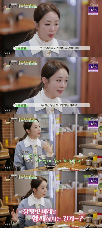 뭔가 이상함을 감지한 허영만은 "처음 만났는데 자기 사업 얘기를 해?"라고 물었고, 박은영은 "그래서 저는 '이 남자가 나를 마음에 들어 하는구나.Heo Young-man, who sensed something strange, asked, "It's my first time meeting you, and you're talking about your business?" Park Eun-young said, "That's why I like this guy." 장밋빛 미래를 함께하자는 건가~?'이렇게 착각을 한 거지"라고 당시 심경을 고백해 웃음을 자아냈다.Are you saying we should share a rosy future together? "I misunderstood it like this," he confessed his feelings at the time, drawing laughter.