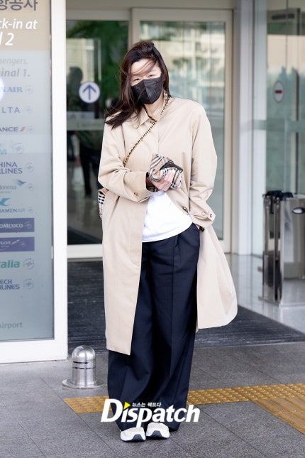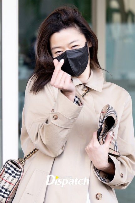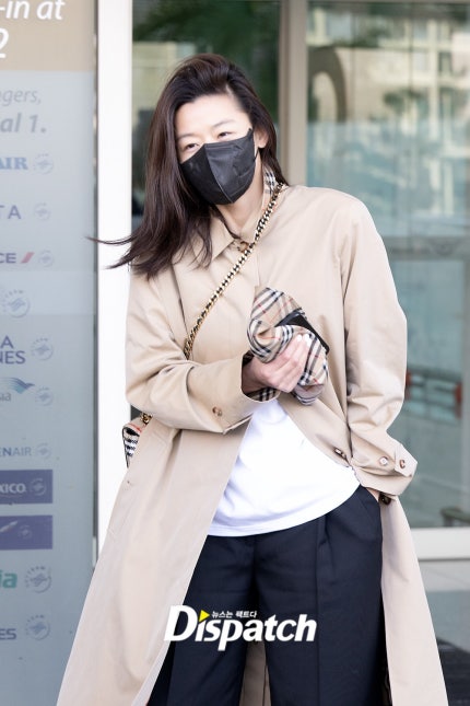 전지현은 이날 블랙 슬렉스에 롱코트를 매치해 우아한 공항패션을 연출했다.Jeon matched long coats with black slacks to create elegant airport fashion. 청순한 미모가 돋보였다.Her innocent beauty stood out.