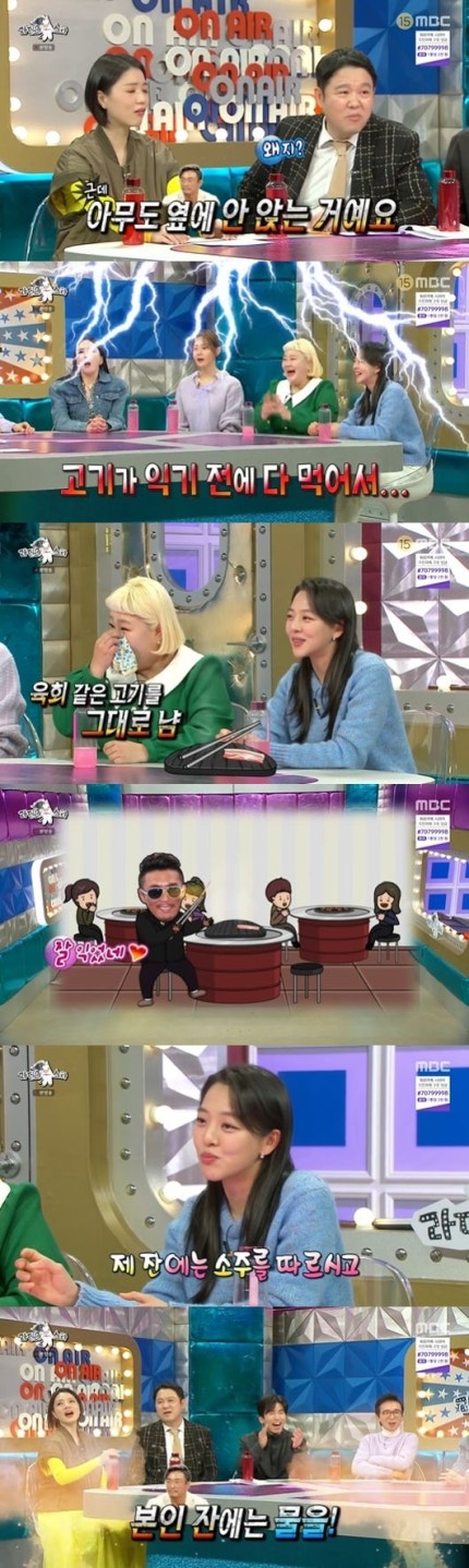 김보름은 "술도 같이 먹었는데 글라스에 술을 드시더라.Kim Bo-reum said, "I drank with him, but he drank with glass. 내 잔에는 소주를 따르시고 자기 잔에는 물을 따랐다.He poured soju into my cup and water into his cup. 약간 환상이 깨졌다"고 덧붙여 웃음을 자아냈다.I'm a little bit disillusioned," he added, drawing laughter.