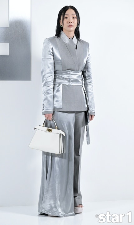 김다미_사이버틱한 분위기의 화려한 수트를 코디한 채로 행사장에 나타난 김다미.Kim Dami_Dami appeared at the venue dressed in a colorful suit with a cyber atmosphere. 화려한 은색과 새틴이 더해진 독특한 소재의 수트가 눈길을 끈다.A suit of unique materials with colorful silver and satin is eye-catching. 유니크한 패션으로 등장해 시선은 사로잡았지만 다소 아쉬운 디테일이 눈에 띈다.It appeared in a unique fashion and caught the eye, but some disappointing details stand out. 특히 포인트 아이템으로 쓰였으나 마치 복대처럼 보이는 허리 끈과 펑퍼짐한 인상을 남기는 와이드 팬츠가 마치 남의 옷을 입은 듯한 어색함을 느끼게 만드니 패셔니스타로서의 김다미의 센스가 묻힌 것 같아 안타깝기만 하다.In particular, it was used as a point item, but it's a pity that Dami Kim's sense as a fashionista is buried as the waist strap that looks like a belly band and wide pants that leave a loose impression make you feel awkward as if you were wearing someone else's clothes.