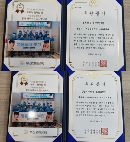 '스터디하우스'는 독거노인을 위해 매달 둘째 수요일에 정기적으로 70만 원 후원과 도시락 나눔 봉사를 진행 중이다.Study House is regularly sponsoring 700,000 won and sharing lunch boxes on the second Wednesday of every month for the elderly living alone. 부산연탄은행(밥상공동체)과 함께한 이 나눔 봉사는 벌써 23회 차를 맞이했다.This sharing service with Busan Briquette Bank has already reached its 23rd anniversary. 누적 후원금 3,480만 원에 달한다.The cumulative donation amounts to 34.8 million won.