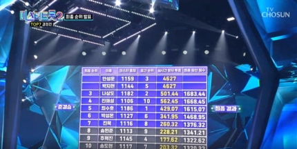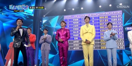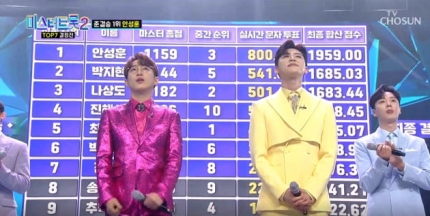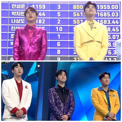 우승 후보로 불리는 박지현과 안성훈도 마찬가지다.The same goes for Park Ji-hyun and Ahn Sung-hoon, who are called favorites for the championship. 두 사람은 각각 중간순위 5위와 3위를 기록했다.The two ranked fifth and third in the middle, respectively. 하지만 실시간 문자 투표가 종료되자 이들은 각각 2위와 1위로 올라섰다.However, when the real-time text voting ended, they rose to second place and first place, respectively.