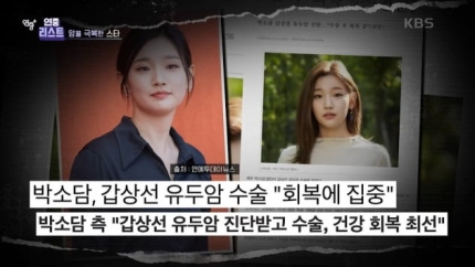 4위는 박소담이었다.Park Sodam came in fourth. 만 29세에 박소담은 갑상선 유두암 확진을 받고 수술하며 회복했다.At the age of 29, Park So-dam recovered by surgery after being confirmed with thyroid papillary cancer. 다행히 발병 6개월 만에 건강한 모습을 보였다.Fortunately, he was healthy six months after the outbreak.