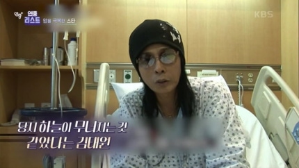 7위는 정미애였다.Seventh place was Jung Mi-ae. 정미애는 뛰어난 노래 실력으로 주목받았지만, 설암 투병 중임을 밝혀 안타까움을 자아냈다.Jung Mi-ae drew attention for her outstanding singing skills, but she revealed that she was struggling with diarrhea, causing regret. 정미애는 설암으로 혀의 3분의 1을 도려내야 할 위기에 처했다.Jeong Mi-ae is in danger of having to cut out one-third of her tongue with tongue cancer. 정미애는 "그때는 남편이 옆에서 흥얼흥얼 노래하는 것도 싫었다"며 "지금은 '할 수 있을 것 같다', 도전할 수 있는 용기가 생겼다"고 말했다.Jeong Mi-ae said, "At that time, I didn't like my husband humming next to me," adding, "Now I think I can do it, and I have the courage to challenge myself." 6위 김태원은 예능 '남자의 자격' 촬영 중 암을 발견했다.Sixth place Kim Tae-won found cancer while filming the entertainment show "Men's Qualifications." '남자의 자격'에서 멤버들은 건강 검진을 받았고, 김태원은 초기 위암 판정을 받았다.In "Men's Qualifications," the members underwent medical checkups, and Kim Tae-won was initially diagnosed with gastric cancer. 김태원은 "하늘이 무너진다는 표현이 생각한다"고 심경을 털어놨다.Kim Tae-won confessed his feelings, saying, "I think the expression of the sky collapsing." 예능 '무릎팍도사'에서는 "내가 죽는 건 두렵지 않은데 내가 사랑하는 아내, 그리고 또 애들은 어떻게 키울건지 죽기가 미안하더라"고 말했다.In the entertainment show "Knee-Pak-Tosa," he said, "I'm not afraid of dying, but I'm sorry to die how I'm going to raise my beloved wife and children." 김태원은 다행히 치료를 잘 마쳤다.Fortunately, Kim Tae-won finished the treatment well.