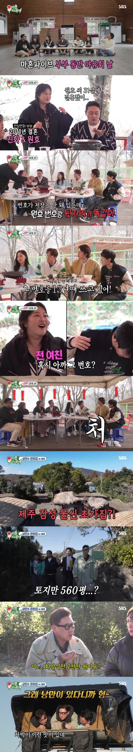 허경환은 마흔파이브와 함께 부부동반 아유회를 가졌는데, 혼자 솔로인 허경환은 딘딘을 파트너로 초대했다.Heo Kyung-hwan had a couple outing with 40 Five, and Heo Kyung-hwan, a soloist, invited DinDin as a partner. 커플 동반 게임을 한 후 야외에서 식사를 하던 중 심진화는 김원효의 과거사를 폭로해 눈길을 끌었다.While eating outdoors after playing a game with a couple, Shim Jin-hwa drew attention by revealing Kim Won-hyo's past history. 심진화는 "결혼 전에 청첩장 을 작성하는데 새벽에 전화벨이 울리더라, 남편이 휴대폰을 보더니 안 받더라.Shim Jin-hwa said, "I was writing an invitation card before marriage, and the phone rang at dawn, and my husband looked at his cell phone and didn't answer it. 그때 여자의 촉이 딱 왔다.Then a woman's feeling came to me. 이름이 저장은 안 되어있는데 남편과 뒷자리가 똑같은 번호였다"라며 전 여자친구를 언급했다.My name is not saved, but the last digit of my husband was the same number," he said, referring to his ex-girlfriend. 이어 심진화는 "이건 결혼 전이고 결혼 후에 또 있다.Shim Jin-hwa then said, "This is before and after marriage. 음성으로 전화를 거는데, '내 사람'을 말하자 갑자기 '내 사랑'이 떴다.I was calling by voice, and when I said "my person," "my love" suddenly popped up. 그 전 여자친구였다"고 말했다.It was his ex-girlfriend." 심진화는 "새 전화기에 컴퓨터 목록을 동기화하면서 예전 번호가 다시 저장된 것"이라 설명했으나 김원효는 연이은 폭로에 당황하는 모습으로 웃음을 안겼다.Shim Jin-hwa explained, "The old number was saved again while synchronizing the computer list with the new phone," but Kim Won-hyo smiled as she was embarrassed by a series of revelations.