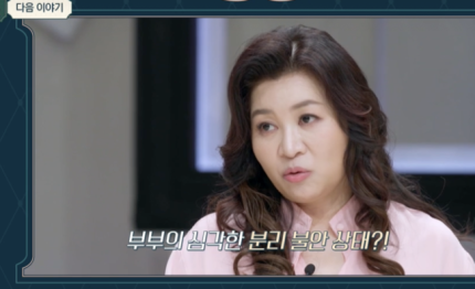 이 가운데 베니는 스튜디오에 D라인을 살짝 공개하며 출연, 그는 9살 연하 남편 안용준에 대해 "함께했으면 좋겠고 남편 없으면 무서워, 화장실가도 문 앞에서 기다리거나 문자를 한다"고 했다.Among them, Benny made a slight appearance on the D-line in the studio, and she said about her husband, Ahn Yong-joon, who is 9 years younger than her, "I wish we could be together, but I'm scared without him, so I wait or text at the door even when I go to the bathroom." 이에 오은영은 "두 사람 심하다"며 "정말 행복해보이지만 그 안에 들여다보면 부부가 심각한 분리불안 상태"라고 전했고 그 이유에 대해 얘기를 나누던 중 베니가 눈물을 보이는 모습이 그려져 어떤 속사정이 있을지 궁증을 남겼다.In response, Oh Eun-young said, "The two look really happy, but if you look inside, the couple is in a state of serious separation anxiety," and while talking about the reason, Benny was crying, leaving questions about what kind of situation there would be.