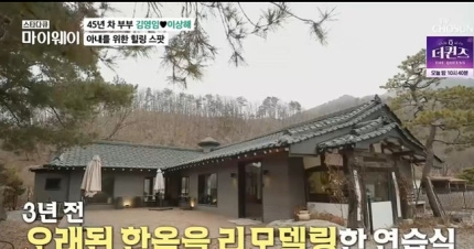 김영임은 남편 이상해와 연습실 겸 세컨하우스로 향했다.Kim Young-im headed to the practice room and second house with her husband, Lee Sang-hae. 으리으리한 한옥스타일의 디자인이 눈길을 사로 잡았다.The magnificent hanok style design caught the eye. 강까지 펼쳐진 풍경.scenery extending to the river 자연 속에서 힐링을 즐긴 두 사람이었다.They were two people who enjoyed healing in nature. 김영임은 "45년 세월 덧없이 흘러가, 수많은 추억, 나의 반성 등 많은 걸 인내해 살았다"고 했다.Kim Young-im said, "45 years have passed without a break, and I have endured many things, including numerous memories and my reflection."