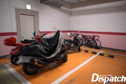 H : 지하 2층 주차장 구석에 마련돼 있다.H: It is located in the corner of the parking lot on the second basement floor. 주차 공간을 비워 오토바이나 자전거 등을 놓을 수 있게 만들었다.The parking space was emptied so that motorcycles and bicycles could be placed. D : 경비실에서 거치대가 보이나?D: Can you see the tripod from the security office?