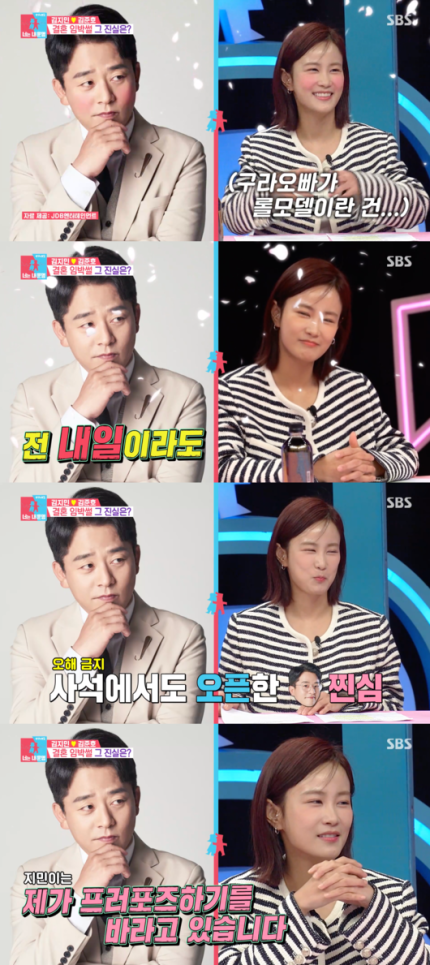 이지혜가 “이거 고백이다”고 하자 김지민은 부끄러워 하는 모습을 보였다.When Lee Ji-hye said, "This is a confession," Kim Ji-min looked embarrassed. 김준호는 “난 내일이라도 (결혼) 가능하다”고 했고 서장훈은 “김준호가 사석에서도 당장 결혼하고 싶다고 했다”고 했다.Kim Joon-ho said, "I can (marry) tomorrow," and Seo Jang-hoon said, "Kim Joon-ho said he wanted to get married right away even in private." 김구라는 김지민이 결혼을 미루는 이유를 묻자 김준호는 “지민이는 내가 프러포즈하기를 바라고 있다”고 말했다.When Kim Gu-ra was asked why Kim Ji-min delayed her marriage, Kim Joon-ho said, "Jimin wants me to propose."