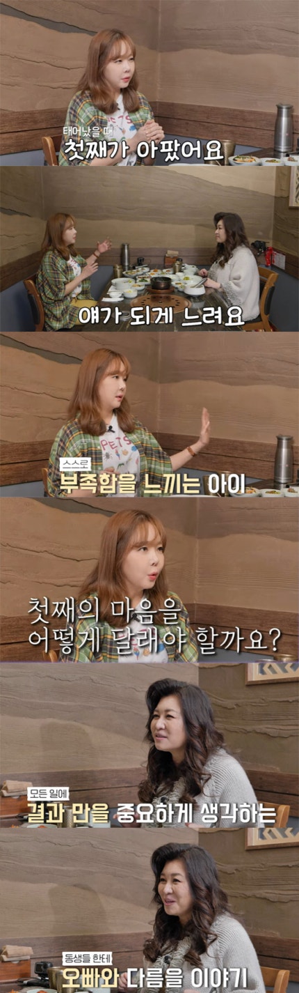 이에 오은영은 "어떤 때는 자꾸 결과나 성취를 너무 따라가거나 뭘 배우면 꼭 잘해내야 된다는 게 있는 거 같다"고 말했다.In response, Oh Eun-young said, "Sometimes, there seems to be something that you must do well if you keep following the results or achievements too much or learn something." 이어 "동생들에게 '넌 운동신경이 잘 발달된 거고 오빠는 조심성이 있는 거다."To my younger brothers," he said, "You have well-developed athletic abilities, and my brother is cautious. 오빠는 초급자가 재밌다고 한다' 이 정도로 이야기하면 된다"며 동생들한테 오빠와 다름을 알려주라고 조언했다.My brother advised his younger siblings to tell him that he is different from his older brother, saying, "Beginners say it's fun."