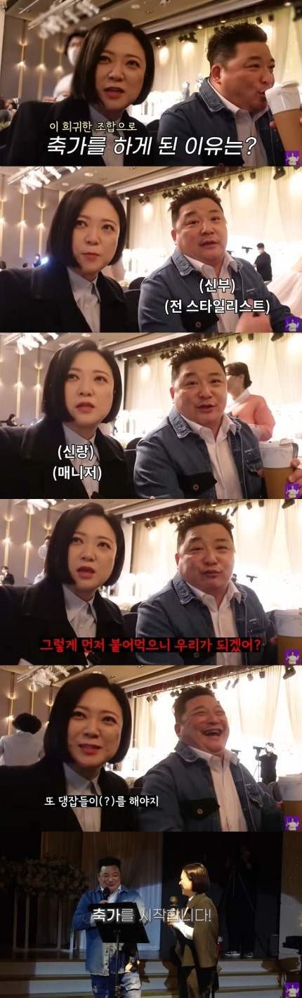 윤정수는 결혼식에 참석한 이유에 대해 "신부가 내 전 스타일리스트"라며 "신랑은 김숙 매니저다, 그렇게 먼저 붙어먹으니 우리가 되겠나"라고 너스레를 떨었다.Yoon Jung-soo said, "The bride is my former stylist," and added, "The groom is manager Kim Sook, will it be us if we stick together first?" 그러자 김숙은 "내가 잡도리를 해야지 정신을 차린다"고 윤정수를 나무라는 모습으로 주위를 폭소케 했다.Then, Kim Sook made people laugh by criticizing Yoon Jung-soo, saying, "I have to do miscellaneous things to wake up."