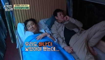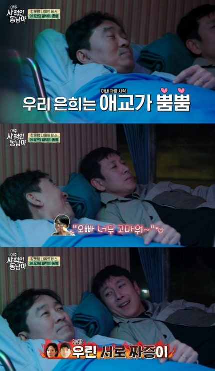 이후 장항준의 아내 김은희 작가 언급은 나이트버스에서도 계속됐다.Since then, the mention of Jang Hang-joon's wife, Kim Eun-hee, has continued on the night bus. 이선균이 두 아들을 자랑하자 장항준은 “우리도 하나 더 낳았어야 하는데”라고 부러워하며 “와이프가 술 먹으면 애교가 뿜뿜이다”며 김은희 작가의 애교를 자랑했다.When Lee Sun-kyun boasted of his two sons, Jang Hang-joon envied, saying, "We should have had another one," and boasted of writer Kim Eun-hee's cuteness, saying, "When my wife drinks, she shows off her cuteness." 이선균은 “닮았다”며 “우리는 서로 짜증이”라고 아내 전혜진을 언급 웃음을 줬다.Lee Sun-kyun smiled referring to his wife Jeon Hye-jin, saying, "We look alike," and "We are annoyed with each other." (사진=tvN 예능 ‘아주 사적인 동남아’ 캡처)(Photo=tvN variety show "Very Private Southeast Asia" capture)