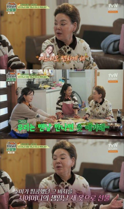이에 김수미는 "우리 며느리는 연예계 후배 같아~Kim Su Mi said, "My daughter-in-law seems like a junior in the entertainment industry." 그렇게 만났기 때문에.That's how I met him. 그리고 자주 안 만나니까 며느리라는 실감이 없어.And since we don't see each other often, I don't feel like a daughter-in-law. 아직도 후배 같아.You still look like a junior. 또 내가 격이 없고 너무 편하게 해주니까 저도 편하게 해"라고 털어놨다.Also, I'm so comfortable because I'm not classy and I'm so comfortable."