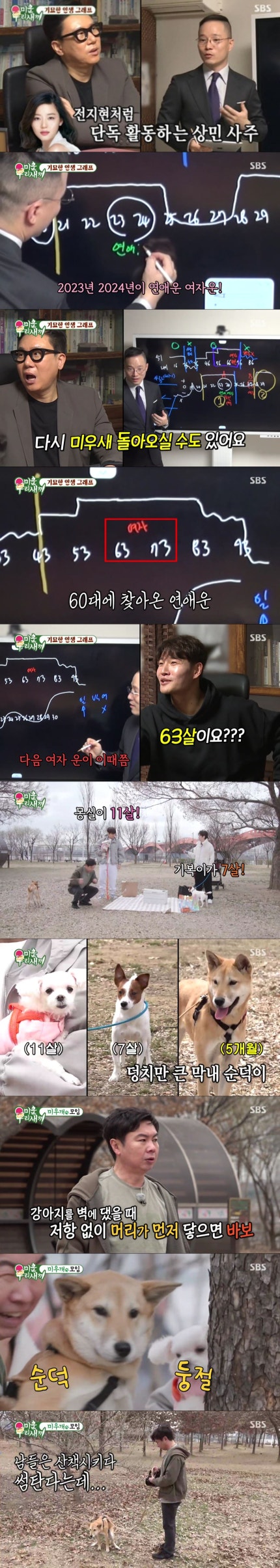 이상민, 김종민, 김종국은 그래프로 보는 사주를 보러 가 관심을 모았다.Lee Sang-min, Kim Jong-min, and Kim Jong-guk drew attention by going to see their fortune-teller on the graph. 역술가는 이상민에게 “23, 24년 정도면 빚은 다 끝날 것 같다.The historian told Lee Sang-min, "I think I'll be out of debt in about 23 or 24 years. 더 중요한 건 이 때에 연애운과 여자운이 있다.More importantly, there is love and woman luck at this time. 운이 상승하기 전에 결혼과 아이운이 꼭 따라온다”고 언급했다.Marriage and child luck always follow before luck rises." 더불어 "아직 자기 인생의 최고 운이 안 왔다.In addition, he said, "I haven't had the best luck of my life yet. 본격적으로 좋은 운이 앞으로 20년간 이어진다”며 배우 전지현과 같은 사주라고 밝혀 이상민을 기쁘게 했다.Good luck will continue for the next 20 years in earnest," he said, delighted Lee Sang-min by saying that he is the same fortune-teller as actor Jeon Ji-hyun. 다만, ‘여자를 잘못 만나면 다시 미우새로 돌아올 수도 있다’고 말해 웃음을 안겼다.However, he smiled by saying, "If you meet a wrong woman, you may come back to Miu-sae."