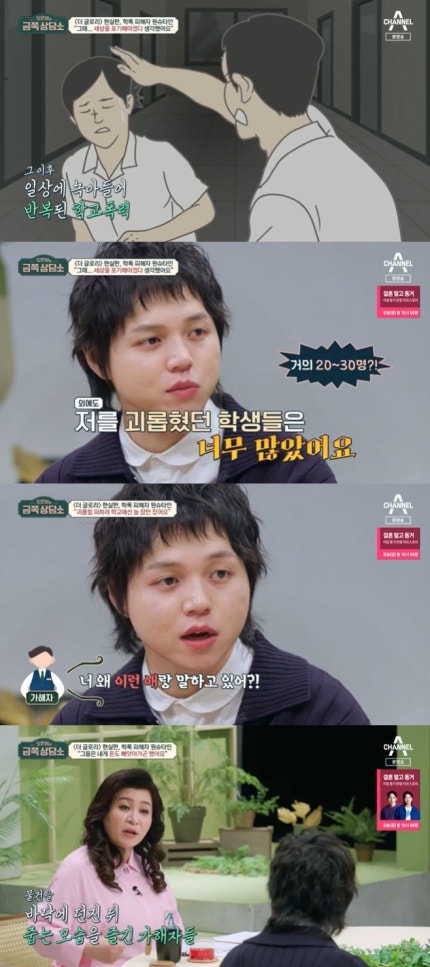 그는 "괴롭히는 사람 자체랑 있는 게 싫었는데 교실 안에 너무 많은 사람들(가해자)이 보이니까 항상 잠을 자려고 했던 것 같다.He said, "I didn't like being with the bully himself, but I think I always tried to sleep because I saw so many people (the perpetrators) in the classroom. 적어도 자는 사람은 안 건들 것 같더라.At least I don't think I'll touch anyone who sleeps. 그런데 어느 날은 아무 예고 없이 와서 정말 놀랄 정도로 머리를 때렸다"라고 밝혔다.But one day he came without any notice and hit me in the head."